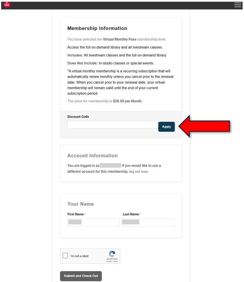 You will know your discount code has been applied when indicated on the next page. After you confirm that your discount code has been applied, click on the Submit and Check Out button.